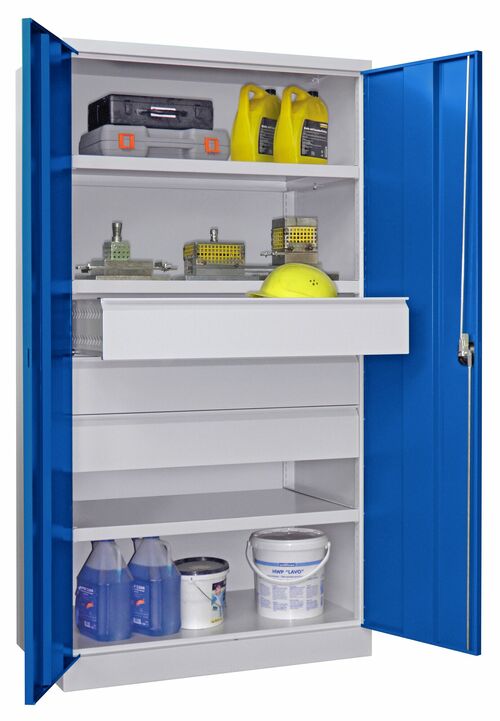 Die Flügeltürenschränke haben einen Gesamtbelastungswert bis zu 1300 kg und die Fachbodenbelastung beträgt bis zu 200 kg. Es gibt Varianten mit und ohne Trennwand, mit Schubladenkonfigurationen und eine XXL-Variante mit den Abmessungen H x B x T 1950x1470x630 mm. Auch bei den Schiebetürenschränken gibt es Schwerlastmodelle mit 1000 kg Gesamttraglast.